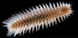 Amphinomidae, also known as the fireworms, bristle worms or sea mice,[2] are a family of marine polychaetes, many species of which bear chaetae mineralized with carbonate.[3] The best-known amphinomids are the fireworms, which can cause great pain if their toxin-coated chaetae are touched or trodden on.[4] Their relationship to other polychaete groups is somewhat poorly resolved.[4]