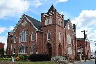 First Baptist Church, is a historic Baptist church located at 401 Oakhurst Street in Kernersville, Forsyth County, North Carolina. It was built in 1915–1916, and is a two-story cross-gabled brick building, with Gothic Revival and Tudor Revival style design elements. It has a cross-gable roof, three-stage corner entrance tower, and retains original furnishings.[2]