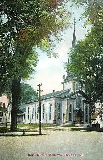 The First Baptist Church is a historic church at 1 Park Street (corner of Elm) in Waterville, Maine. Built in 1826, it is the city's oldest standing public building. It was renovated in 1875 to a design by Francis H. Fassett. It was listed on the National Register of Historic Places in 1976.[1]