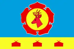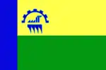 The flag of Khakassia[a] is used by the Republic of Khakassia, a federal subject of Russia. It consists of a blue-white-red horizontal tricolour with a green vertical band on the hoist containing a traditional yellow sun device. The ratio of the flag is 1:2 and it was adopted on 25 September 2003.