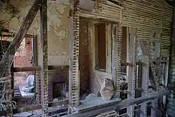 Inside the waiting room of the main station building. It has been derelict since the 1960s, and is boarded up.