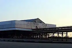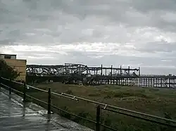 Fleetwood Pier opened on Whit Monday in 1910, a pavilion was added the following year, and a cinema was opened in 1942.[1] The pier was badly damaged on 25 August 1952 after a fire started in the cinema, and did not fully reopen until 1958.[4] At different times, it was an amusement complex, bar and dance hall. The Stefani family were the longest owners in the Pier's history, owning and running Fleetwood Pier from the 1960s until 2000. The pier was first closed in 2000 when its owners went into liquidation, but it was reopened under new ownership in 2003, after Roger Stefani sold it.[2] Safety concerns forced the pier to shut once more, and when it was gutted by fire in September 2008 it had been closed for almost two years. At that time, the owners, Simmo Developments, had submitted plans to convert the structure into an apartment complex.[5]