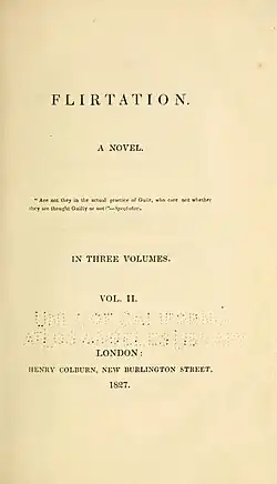 Flirtation is an 1827 novel by the British writer Lady Charlotte Bury, originally published in three volumes. Bury, writing anonymously, was a well-known author of silver fork novels set in high society. It was a popular success and quickly ran through three editions.[1]