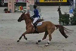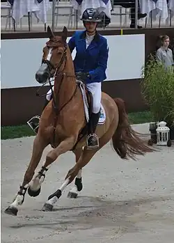 In April 2016, she won the Antwerp leg of the Global Champions Tour[25] ahead of another French rider, Simon Delestre, thanks to a triple clear round.[26] In June, Flora and her rider fell on an oxer during the jump-off at the CSIO5* (5-star international Olympic jumping competition) in Rotterdam.[27] Extensive veterinary examinations reveal no injuries or health problems, allowing Flora de Mariposa to remain in contention for the 2016 Summer Olympics.[28] The pair will compete at the Rio Olympics,[29] with the mare arriving on South American soil on the night of Sunday August 7.[30] Representing a reasonable medal chance for France,[31] she suffered a bout of colic on the evening of Friday August 12,[32] but recovered the following day.[33] During qualifying, the mare and her rider fell on an oxer, eliminating Pénélope Leprevost and Flora de Mariposa from the individual classes.[34] The mare and her rider nevertheless took part in France's team gold medal.[35]