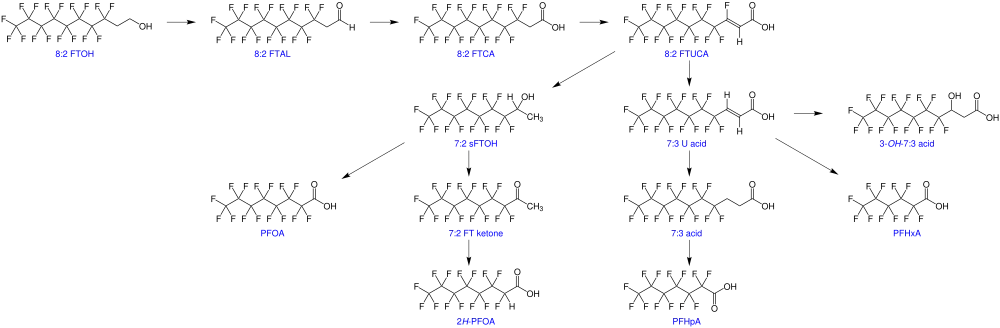 Fluorotelomer alcohols can biodegrade to perfluorinated carboxylic acids, which persist in the environment and are found in the blood serum of populations and wildlife, such as the toxic PFOA and PFNA.[8][9]
