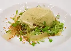In cuisine, foam is a gelled or stabilized liquid in which air is suspended. Foams have been present in many forms over the history of cooking, such as whipped cream, meringue and mousse. In these cases, the incorporation of air, or another gas, creates a lighter texture and a different mouthfeel. Foams add flavor without significant substance, and thus allow cooks to integrate new flavors without changing the physical composition of a dish.[1]