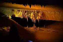 The cave descends several hundred feet below the surface, where an underground river, grottos, and chimneys can be found. The underground stream is supplied by a large underground lake located beneath English Mountain. The temperature inside the caverns remains at a near-constant 58 degrees and tends to stay the same year-round.[2]