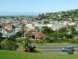 ![]() The Frances Hodgkins Retirement Village and the spire of Dunedin's LDS Church lie to the west of Forbury Road, as seen from Wilson Avenue, Forbury | |