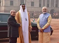Countries considered India's closest include the United Arab Emirates,[58]Russian Federation,[59]Israel,[60] Afghanistan,[61] France,[62] Bhutan,[63] Bangladesh,[64] and the United States. Russia is the largest supplier of military equipment to India, followed by Israel and France.[65] According to some analysts, Israel is set to overtake Russia as India's largest military and strategic partner.[66] The two countries also collaborate extensively in the sphere of counter-terrorism and space technology.[67] India also enjoys strong military relations with several other countries, including the United Kingdom, the United States,[68] Japan,[69] Singapore, Brazil, South Africa and Italy.[70] In addition, India operates an airbase in Tajikistan,[71] signed a landmark defence accord with Qatar in 2008,[72] and has leased out Assumption Island from Seychelles to build a naval base in 2015.[73]