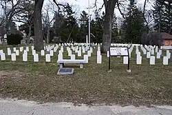 A section of the cemetery is known as Confederate Rest. On it lie about 140 Confederate prisoners of war who died while in confinement in a Union camp in Madison, Camp Randall,[6] in 1862.[7] A stone marker or cenotaph lists the names of 132[8] of the prisoners who died in custody. In October 2018, the Madison City Council voted 16 to 2 to remove the marker with the list of buried prisoners, overturning the Landmarks Commission, which had denied a permit to remove the marker,[9] which was built in 1906.[10] The eradication of the cenotaph was seen by some in city government as a "reparation,"[11] and was supported by the Equal Opportunities Commission of the city government.[12]