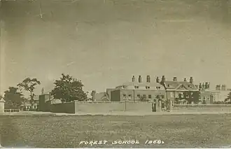 The earliest buildings at the front of the school date from the eighteenth century, when the site consisted of brick kilns and adjoining cottages owned by Thomas Skingle, a brick maker.[3] In 1830 Exeter College was established there by William Oram, however it was unsuccessful and by 1833 had closed down. However, this did not deter the owner, Archibald du Boulay, and following a meeting at his house on 17 February 1834 it was decided to try again, and thus the idea of Forest Proprietary Grammar School was launched. The owners of the new school were mainly local dignitaries, their President was William Taylor Copeland, and they recruited Rev. Thomas Dry as the first headmaster. The school opened on 1 October 1834 with 22 pupils.[4]