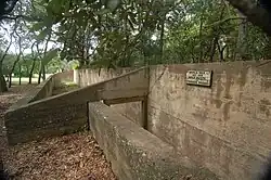The US War Department approved construction of the rifle range on January 21, 1918 for small arms training of soldiers. After World War II, it was declared surplus and sold, and over the years left untended, the range walls were undermined due to tree roots and water infiltration. Of special concern were the load-bearing supports across interior doorways which were cracking and separating from the walls. In 2012, work started on restoring the range, which involved among other things using contracted labor and volunteers to initially stabilize the walls. Currently, Friends of Fort Caswell Rifle Range, a non-profit formed in 2015, is carrying on this task with the full support of the Town of Caswell Beach and the Caswell Dunes Homeowners Association.[4] On April 5, 2018, the U.S. World War I Centennial Commission and the Pritzker Military Museum and Library announced that the 1918 Fort Caswell Rifle Range was one of the one hundred WWI memorials chosen for a restoration grant and honored with the official national designation as "WWI Centennial Memorial".[5] And then on November 11, 2018, the 100th Anniversary of the WWI Armistice Day, the Brunswick County WWI Monument recently erected on site, was dedicated to commemorate the veterans who fought in the war.[6] In addition to managing the facility, in 2020 the Friends of Fort Caswell Rifle Range arranged to publish Brunswick County in the Great War[7] Containing biographic sketches of all known Brunswick County NC WWI service members, the book features a 25 page introductory section with photos and diagrams along with text about the Caswell Beach rifle pits that chronicles its history.