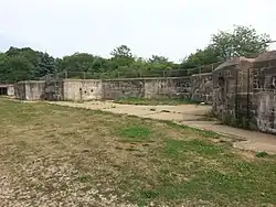 Fort Foster originally had two gun batteries: Battery Bohlen with three 10-inch (254 mm) M1895 disappearing guns and Battery Chapin with two 3-inch (76 mm) M1902 guns on pedestal mounts.[4] Battery Bohlen was built in 1898-1901 and Battery Chapin was completed in 1904.[3] Battery Bohlen was named for Brigadier General Henry Bohlen, killed in the Civil War, and Battery Chapin was named for Brigadier General Edward Chapin, also killed in the Civil War.[3] In 1909 a secondary control station for an underwater minefield in the harbor was added; Battery Chapin was built primarily to defend this minefield against minesweepers.[3]