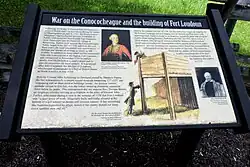 Information board at the Fort Loudoun Historical Society, showing the Earl of Loudoun, one of the fort's shooting platforms, and James Smith.