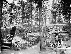 The Fountain Head Campground property was sold to land developers in 1885, and the following year the three-story, fifty-room Fountain Head Hotel was completed, overlooking the campground's spring. With the completion of the hotel, the community began expanding. In 1890, a post office was established, and since the name "Fountain Head" had already been claimed by another town in Tennessee, the community settled on the name "Fountain City." That same year, the heart-shaped Fountain City Lake was completed, and a railroad known as the "Dummy Line" was constructed to connect the community to Knoxville (its southern terminus was at Emory Place). The Dummy Line remained in operation until 1905, when it was replaced by a trolley.[6]