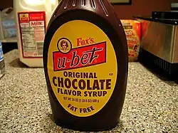 Fox's U-bet chocolate syrup is a commercial chocolate syrup originally made by H. Fox & Company in Brooklyn, New York starting c. 1900.[1][2] It was said to be invented in a basement in Brownsville, Brooklyn, according to David Fox. Herman Fox, his grandfather, left town for the Texas oil boom and returned only with the phrase "you bet."[3] U-bet syrup is best known as being a key component in the fountain beverage, the egg cream.[4] While the specific order in preparation is subject to much debate within New York City, the components of the classic egg cream recipe consist of U-Bet syrup, milk and seltzer. The beverage has since become an iconic staple in New York's Jewish delis since its invention in the 1880s.[5] H. Fox & Company was acquired by US Westminster Foods in 2016, and is currently manufactured in Farmingdale, New York.[6]