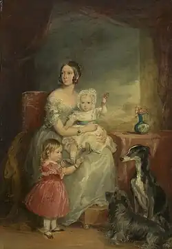 Grant married, firstly, Amelia Farquharson (died 1827), the daughter of a Scottish laird, in 1826; she died after giving birth to their son. He married again, in 1829, Isabella Elizabeth Norman, daughter of Richard Norman and his wife Lady Elizabeth Isabella, and a niece of John Manners, 5th Duke of Rutland; they had three sons and four daughters.[1][4] Among the sons was Ferdinand Hope-Grant, a chaplain to the Prince of Wales.[9] One of the daughters was Anne Emily Sophia Grant (also known as Daisy Grant or Mrs. Colonel William Thomas Markham), whose portrait, by her father, hangs in the National Gallery of Scotland, and has been noted for its depiction of Victorian womanhood.[10][11][12]