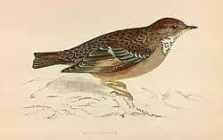 Alpine Accentor. Hand coloured, wood-block print by Alexander Francis Lydon for 'A History of British Birds' by Francis Orpen Morris. First Edition published by Groombridge & Son. London 1850–1857. Printed by Benjamin Fawcett in Driffield. From the collection held by RestoredPrints.com