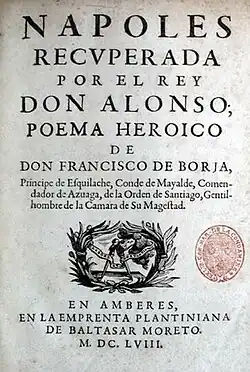 4. ^ Napoles recuperada por el rey don Alonso / poema heroico de don Francisco de Borja, Principe de Esquilache, conde de Mayalde, comendador de Azuaga, de la Orden de Santiago, Gentilhombre de la Camara de Su Magestad
