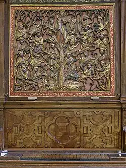 In 1559, he returned to Spain and took up a position as organist at the Cathedral of Sigüenza, where he worked until moving to a similar position at the Cathedral of León in 1561. In 1567 he took up the professorship of music at the University of Salamanca, where he met the celebrated poet Fray Luis de León, also a professor at the university. In 1571, alongside Fray Luis de León and Diego de Castilla (then the rector of the University of Salamanca), he formed part of the jury for the literary prize that had been organised to celebrate the Spanish victory at the Battle of Lepanto and the birth of prince Ferdinand.[2] Fray Luis de Leon admired Salinas greatly, and in 1577 wrote a famous ode, the Oda a Francisco Salinas, in homage to the musician.[3]