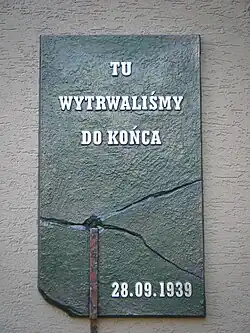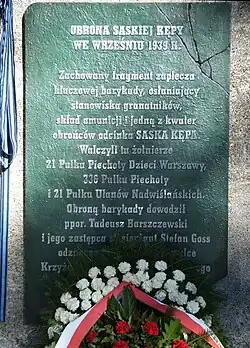 During the defense of Warsaw in September 1939, a crucial barricade was located at the corner of Francuska and Zwycięzców streets.[12] Polish soldiers from the 21st Infantry Regiment "Children of Warsaw", the 21st Vistula Uhlan Regiment, and the 336th Infantry Regiment fought here against the German 44th Infantry Regiment from East Prussia, whose arrival was preceded by Luftwaffe bombings. Seven defenders were awarded the Silver Crosses of the Virtuti Militari as early as 27 September 1939.[13]