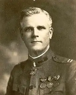 With 11 other scouts, without waiting for the supporting battalion to aid them or to get into a position to do so, charged over a distance of about 150 yards (140 m) and completely routed about 300 of the enemy who were in line and in a position that could only be carried by a frontal attack.