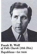 Frank Rudolph Wolf (born January 30, 1939) is an American politician who served as the U.S. representative for Virginia's 10th congressional district from 1981 to 2015. A member of the Republican Party, he announced in December 2013 that he would not seek re-election in 2014. He was succeeded by his former chief of staff and Republican state delegate Barbara Comstock.[3] At the time of his retirement, he was the dean of the state's congressional delegation, having served for 34 consecutive years.[4]
