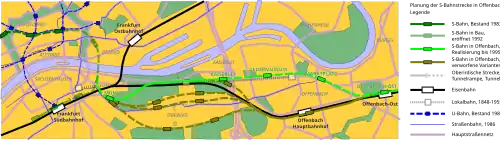 Prior to the construction of the line between Frankfurt and Offenbach, five different options were examined. Three options provided for the extension of the Frankfurt City Tunnel in different forms, in which a tunnel from Oberrad was planned in the southern (option D), middle (option C) or northern (option B) areas and the line would then run from the western boundary of the Offenbach built-up area parallel to the existing long-distance line towards Offenbach Hbf. However, these options would have meant—at least during the construction period, possibly also permanently due to changes in groundwater flows–a massive intervention in the usability of the areas for agriculture, so that some saw it as a threat to farms in Oberrad. After protests, the city of Frankfurt withdrew its original approval for the Oberrad routes.