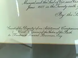 Photo of the page presented to Fred Brooman CB by the Order of the Bath's Grand Master.