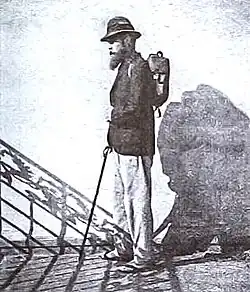 Burlingham left Paris near the end of 1912 and returned to London, where he was soon hired by the British and Colonial Kinematograph Company. In 1913 the company assigned him to travel to Switzerland to film ski-jumping, curling, sleighing, and other Alpine winter sports around St. Moritz.[2] Equipped with a bulky hand-cranked movie camera, a half-plate still camera, and a set of tripods, he also recorded his trek at higher elevations through deep snow at the Bernina Path, as well as ascents of the Matterhorn, Mont Blanc, and the Jungfrau.[4] He continued from those sites to southern Italy, capturing additional scenic footage as he traveled to Mount Vesuvius. There he filmed on December 21, 1913, a deep descent into the volcano's interior. Burlingham and his three Italian assistants were nearly asphyxiated by sulphuric fumes as they used ropes to lower themselves down over 1200 feet "to the bottom of the cone".[4][7] In addition to releasing Burlingham's films The Ascent of the Matterhorn and Descent into the Crater of Vesuvius, the British and Colonial Company between the latter half of 1913 and August 1914 distributed to English cinemas 21 much shorter travelogues shot by him. Most of those short subjects, which averaged only about seven minutes in running time, consisted of tourist-style depictions of the countryside and resorts in southern France, Switzerland, and in the lake district of northern Italy.[2][d]