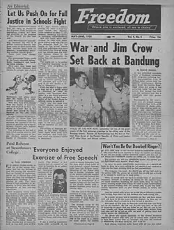 Freedom was a monthly newspaper focused on African-American issues published from 1950 to 1955.[1] The publication was associated primarily with the internationally renowned singer, actor and then officially disfavored activist Paul Robeson, whose column, with his photograph, ran on most of its front pages. Freedom's motto was: "Where one is enslaved, all are in chains!"[2] The newspaper has been described as "the most visible African American Left cultural institution during the early 1950s."[3] In another characterization, "Freedom paper was basically an attempt by a small group of black activists, most of them Communists, to provide Robeson with a base in Harlem and a means of reaching his public... The paper offered more coverage of the labor movement than nearly any other publication, particularly of the left-led unions that were expelled from the CIO in the late 1940s... [It] encouraged its African American readership to identify its struggles with anti-colonial movements in Africa, Asia, and the Caribbean. Freedom gave extensive publicity to... the struggle against apartheid."[4]