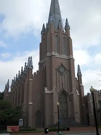 Freemason Street Baptist Church is a historic Baptist church located at Norfolk, Virginia. It was designed by architect Thomas Ustick Walter and dedicated in 1850. It is a one-story, Perpendicular Gothic-style stuccoed brick church. The front facade features a projecting belfry and two stage tower topped by an octagonal spire.[3]