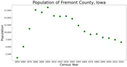 Fremont County is a county located in the U.S. state of Iowa. As of the 2020 census the population was 6,605, making it the state's seventh-least populous county.[1] The county seat is Sidney.[2] The county was formed in 1847 and named for the military officer John C. Frémont.[3]