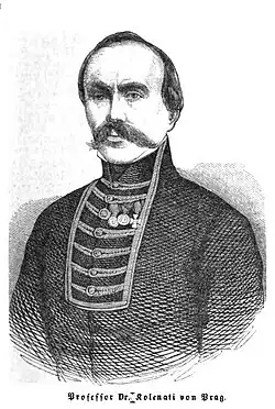 In 1845 Kolenati returned to Prague, where he was named an Associate Professor of Natural History. In 1848 he played an active part in the revolutionary events of the time, for which he was subsequently arrested. After his release from prison, he gave lectures in mineralogy and zoology at the Prague Polytechnic Institute and worked as a professor of natural history at the Lesser gymnasium. In 1848 he co-founded the Lotos Science Association, and was appointed full professor of natural science and technology at the Polytechnic Institute at Brno. In this department during his tenure significantly expanded its natural history collections, especially its mineralogical collections. He also became an early mentor of Gregor Mendel.[2] He died while on a research trip to Praděd and is buried in Little Morávka.[1]