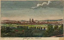 From 1778 to 1779, Waagen studied at the Kunsthochschule Kassel, founded in 1777, where Johann Heinrich Tischbein the Elder was also a professor of Drawing and Painting.[5] Subsequently, from 1779 to 1781, he travelled together with his friend Johann Heinrich Tischbein the Younger (1751-1829) to Italy via Nuremberg. Tischbein had received a scholarship from the Kassel Academy of Art for this trip[6] and wrote about it: "My travelling companion was Mr Waagen from Göttingen, who had studied architecture and painting in Kassel, but now wanted to devote himself entirely to painting in Rome. [...] My friend Waagen copied 'The Sacrifice of Noah after the Flood' by Poussin in the Corsina Gallery. The work was intended for his benefactor and therefore gave him double pleasure.")[7]