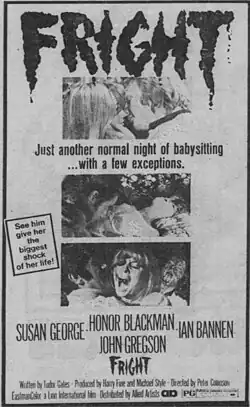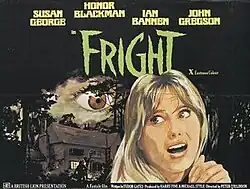 Fright is a 1971 British thriller film starring Susan George, Ian Bannen, Honor Blackman, and John Gregson. The film follows a babysitter who is terrorized one evening by her employer's deranged ex-husband. Its original working titles were The Baby Minder and Girl in the Dark before it was titled Fright.[4] It is said by many horror fans and commentators to be one of or even the first film in which an isolated babysitter is stalked by an unrelenting and psychopathic antagonist, rendering it the forerunner of dozens of movies to use similar premises over the following decades.[5]