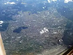 An aerial photo of a portion of Fukushima Basin, facing south. The Ōu Mountains can be seen along the right side of the image. Mt. Shinobu can be seen in the center-left as the mountain surrounded by the city, with the Abukuma River flowing south–north to the east (left) of Mt. Shinobu. To the north (bottom) of Mt. Shinobu is the Matsukawa River flowing east (left) into the Abukuma River. A little south (above) of Mt. Shinobu the Arakawa River also flows east (left) into the Abukuma River.
