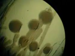 Funneliformis mosseae is a species of fungus in the family Glomeraceae, which is an arbuscular mycorrhizal (AM) fungi that forms symbiotic relationships with plant roots. Funneliformis mosseae has a wide distribution worldwide, and can be found in North America, South America, Europe, Africa, Asia and Australia.[1] Funneliformis are characterized by having an easily visible septum in the area of the spore base and are often cylindrical or funnel-shaped. Funneliformis mosseae similarly resembles Glomus caledonium, however the spore wall of Funneliformis mosseae contains three layers, whereas Gl. caledonium spore walls are composed of four layers.[2] Funneliformis is an easily cultivated species which multiplies well in trap culture, along with its high distribution, F. mosseae is not considered endangered and is often used for experimental purposes when combined with another host.[1]