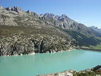 Göscheneralpsee is a reservoir in the municipality of Göschenen, Canton of Uri, Switzerland. The volume of the reservoir is 76 million cubic metres (62,000 acre⋅ft) and its surface area 1.32 km2 (0.51 sq mi).