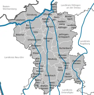 Baden-WürttembergAugsburg (district)Dillingen (district)Neu-Ulm (district)UnterallgäuWinzerwaldEbershauser-Nattenhauser WaldAichenAletshausenBalzhausenBibertalBreitenthalBubesheimBurgauBurtenbachDeisenhausenDürrlauingenEbershausenEbershausenEllzeeGünzburgGundremmingenHaldenwangIchenhausenJettingen-ScheppachKammeltalKötzKrumbachLandensbergLeipheimMünsterhausenNeuburg an der KammelOffingenRettenbachRöfingenThannhausenUrsbergWaldstettenWaltenhausenWiesenbachWinterbachZiemetshausen