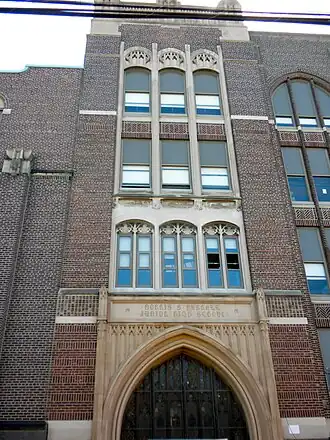 The current school building was built in stages. The first building was designed by Henry deCourcy Richards in 1908. An expansion was built in 1926–1927 and was designed by Irwin T. Catharine. The Richards building is a three-story, three-bay, brick building on a raised basement in the Late Gothic Revival-style. The Catharine building is a four-story, seven-bay, brick building on a raised basement in the Art Deco-style.[2]