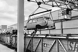 | GMH Elizabeth track plan, late 1980s | Loading vehicle bodies for further assembly in Melbourne | Railcars waiting for shift-change passengers, March 1982 |