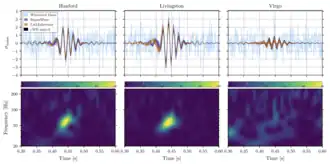 ![]() The GW event GW190521 observed by the LIGO Hanford (left), LIGO Livingston (middle), and Virgo (right) detectors | |