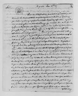 Following his retirement from his position as Clerk of Court for Hampshire County, Jones continued to remain active in Virginia political affairs. In 1784, George Washington visited and dined with Jones at his home at Bogota.[4] In 1788, Jones and his brother-in-law Thomas Lewis were elected to represent Rockingham County at the Virginia Ratifying Convention, where both were fervent proponents for the adoption of the United States Constitution.[2][10][d] Archibald Stuart of neighboring Augusta County traveled to Rockingham to canvass for Jones prior to the election, and in return, Jones gifted Stuart a chaise to enable Stuart and his wife to return home to Augusta County.[10] Jones was among the first trustees of the Staunton Academy, following its incorporation by an act of the Virginia General Assembly on December 4, 1792.[25]