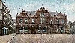 The new building was designed by Meeke and Bramall in the Italianate style, built in red brick with stone dressings at a cost of £3,250 and completed in 1892.[5] The design involved a symmetrical main frontage with eight bays facing onto the Market Square; the central section of two bays featured two round-headed windows on the ground floor with a single large round-headed window on the first floor flanked by pilasters supporting a pediment containing a clock in the tympanum. There were doorways in the third and the sixth bays. The left and right sections, which contained round-headed windows on the ground floor and sash windows on the first floor, were also flanked by pilasters supporting pediments at roof level. Internally, the left hand section contained retail units and a butter market, while the right hand section contained the council chamber.[2][6]