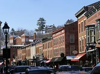The Galena Historic District contains more than 1,000 buildings constructed before 1900 that are considered contributing properties.[6][8] The center of downtown Galena is laid out in three parallel segmental tiers starting at Main Street closest to the river. Beyond Main Street, and at a higher elevation, are Bench and Prospect Streets.[6] Main Street forms the primary commercial strip through Galena and is lined with buildings two, three, and four stories tall.[3][6] Most of Main Street's structures are built of red brick and cast in Federal style of the simple commercial style of the 1840s.[3][6]