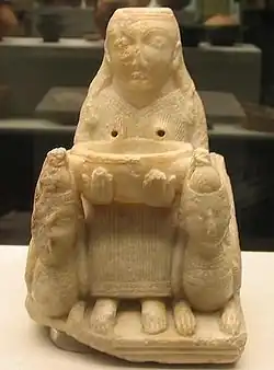 The "Lady of Galera" or "Goddess of Galera" (see image at left) was found in the 5th century BCE tomb number 20, zone 1 of the Necropolis.[8] The figurine, which is currently on display in Madrid, is Phoenician and from the 7th century BCE.[8] It is similar to another found in Carthage, North Africa), made of alabaster, and probably represents the goddess Astarte.[8] The "lady" or "goddess" is seated between two sphinxes and has an opening through which liquid can be poured into it, which will emerge from small holes corresponding to the nipples of the breasts.[8] The robust forms of the figure suggest Mesopotamian influences; the stylization of the clothing and hair suggest Egyptian influences. It is believed that this sacred object was passed down for many generations before being used as part of a burial.