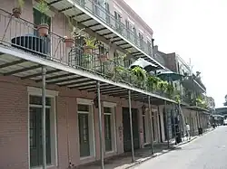 In 1763 following Britain's victory in the Seven Years' War, the French colony west of the Mississippi River – along with New Orleans – was ceded to the Spanish Empire as a secret provision of the 1762 Treaty of Fontainebleau.[10] The Spanish considered the Province of Louisiana a buffer zone to protect their Mexican colony and did not invest significantly in transforming local culture in New Orleans, known to the Spanish as La Nueva Orleans.[6] By 1765, almost every building exhibited a front gallery on the first floor, and many two-story buildings showcased two-story galleries.[8]