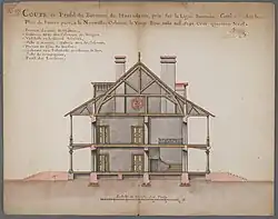 In a 1731 plan, high hip-roof houses in New Orleans were spaced across city blocks, surrounded by gardens, and positioned with their front sides either directly at or near the sidewalk. Some of these houses featured full front galleries. An example of such house style with a raised basement can still be seen at Madame John's Legacy. Although the house was destroyed and rebuilt in 1788, it retained its original design from circa 1730.[8] By the mid-18th century, New Orleans was transformed into a French village with picket-fenced gardens and wooden galleries.[7]