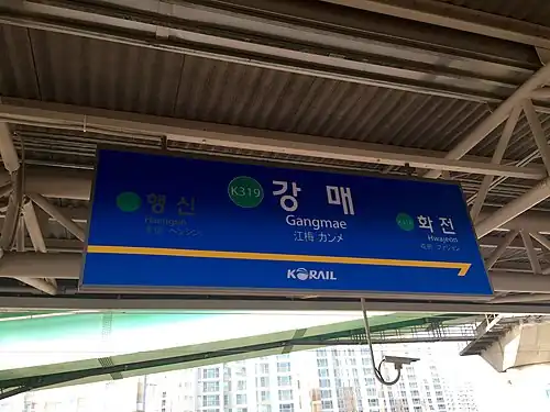Gangmae station is a railway station on the Gyeongui–Jungang Line. It closed July 2009 due to its proximity to Haengsin station but was reconstructed and reopened on October 25, 2014 following the development of the surrounding area.